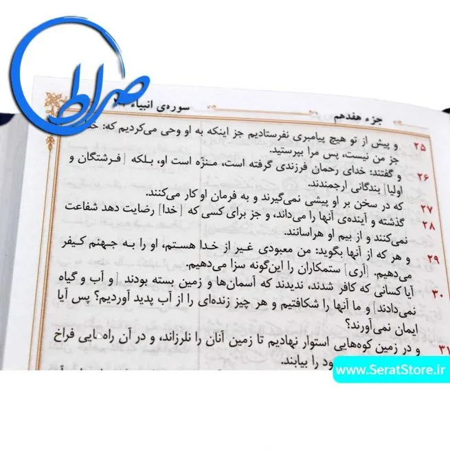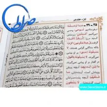 ترجمه آیات این قرآن در صفحه مقابل آن قرار دارد .
